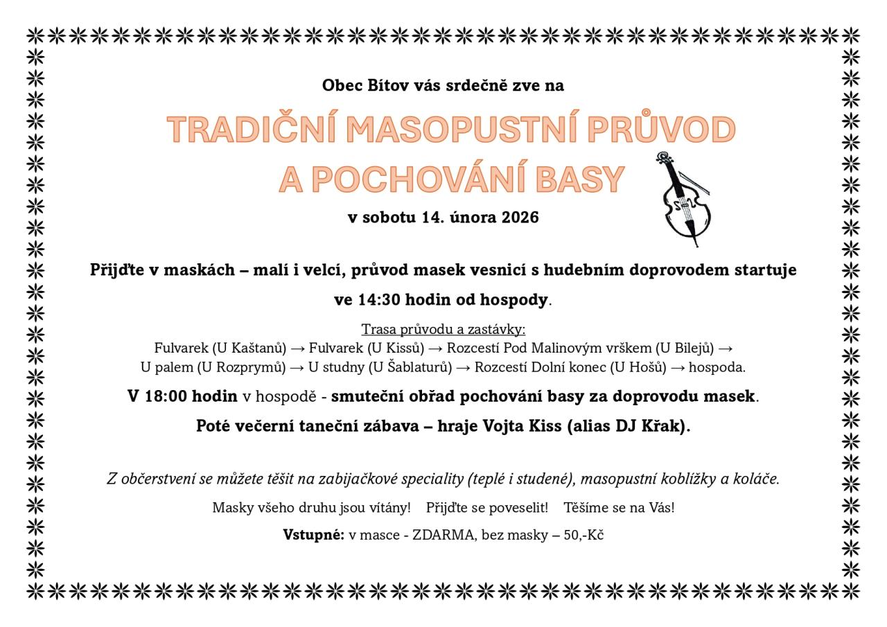 Průvod masek, malých i velkých, s hudebním doprovodem vyrazí od hospody ve 14:30. Trasa zahrnuje několik zastávek a večer od 18 hodin se můžete těšit na smuteční obřad pochování basy za doprovodu masek a následnou taneční zábavu s DJ Křakem.